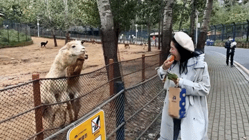 Không rõ là do hành động ‘mất vệ sinh’ khi cắn đôi củ cà rốt hay là do phải chờ lâu mà một con lạc đà cừu đã phản ứng bằng cách nhổ nước bọt vào cô gái.